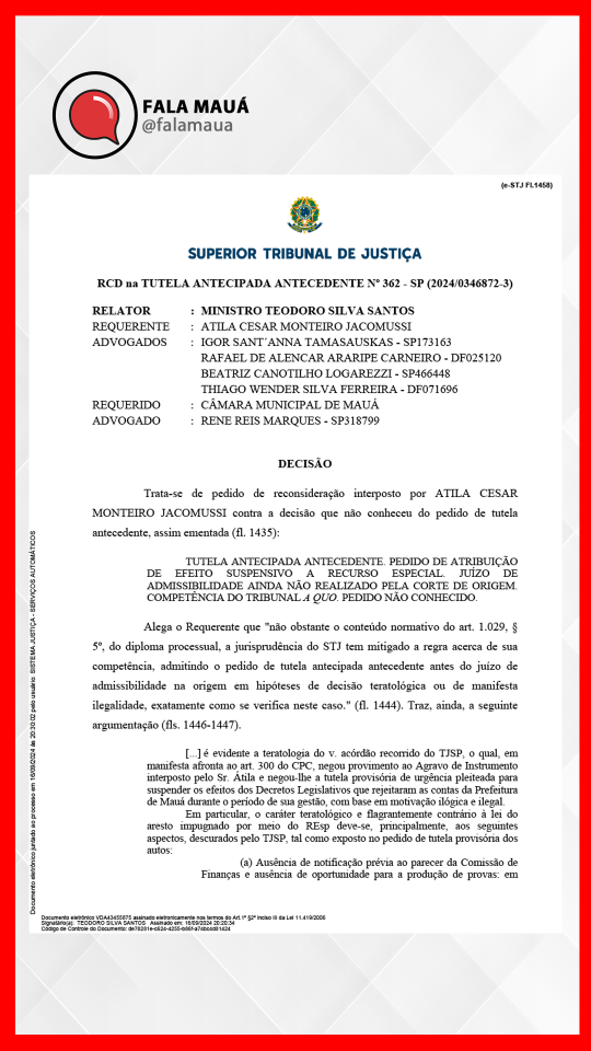 O Ministro Teodoro Silva Santos, do STJ, acatou os argumentos da defesa e reconheceu que houve falhas no processo de rejeição das contas. A decisão suspende temporariamente os efeitos dos decretos legislativos que rejeitaram as contas de Jacomussi dos anos de 2017 a 2020. Com isso, a Justiça Eleitoral deverá permitir o registro de sua candidatura, o que coloca Jacomussi novamente na disputa pela prefeitura de Mauá.